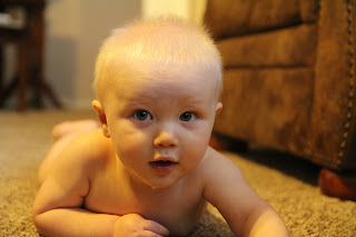 *update* This week his top teeth started coming in. One has broken through so far. To soothe him, we have been giving him frozen gogurts and he goes crazy! He has also started to fake cough and fake yawn to get attention. He still can't crawl 'normally' but gets around really fast. He has started scooting on his bum, its a half crawl, half scoot thing. He has also started to wave. At first he only would wave to Grandma Jill. Then he waved to my Grandma Alexander. Now wave's to everyone.
